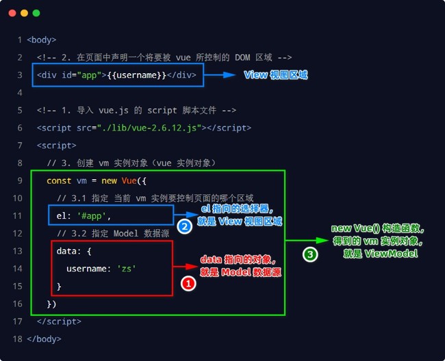 ① 导入 vue.js 的 script 脚本文件 ② 在页面中声明一个将要被 vue 所控制的 DOM 区域 ③ 创建 vm 实例对象( vue 实例对象)
