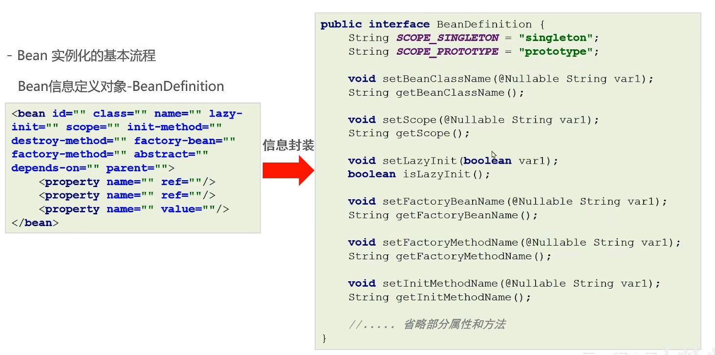 加载xml配置文件,解析获取配置中的每个<bean>的信息,封装成一个个的BeanDefinition对象;