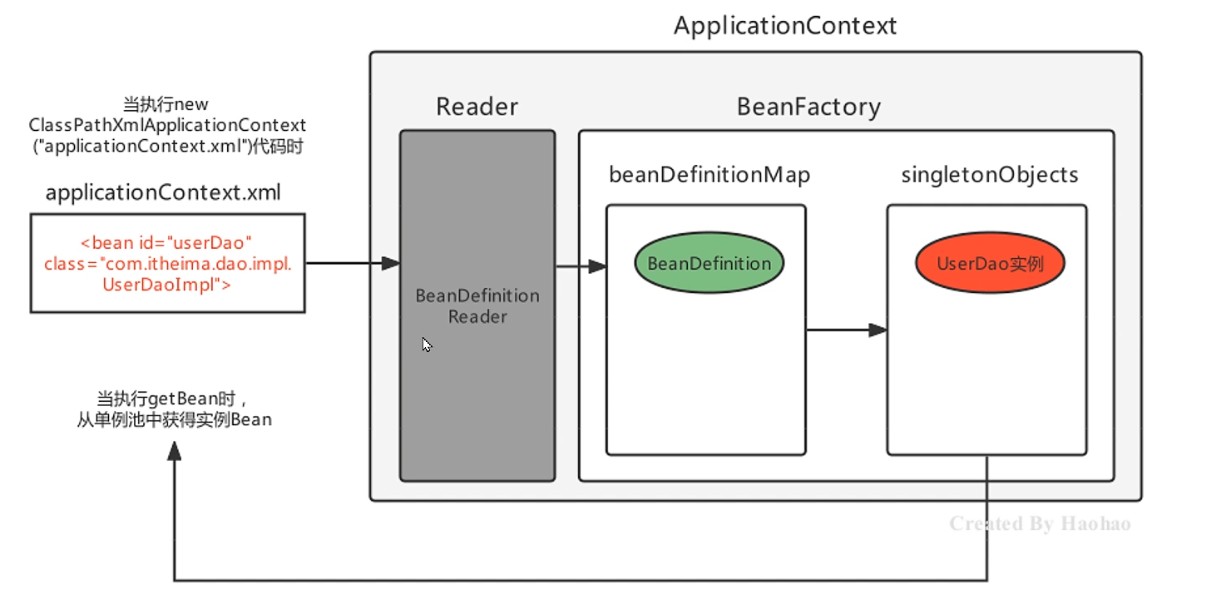 在applicationContext对象创建时,applicationContext.xml 中多个Bean 也同时被 Spring 实例化并管理。