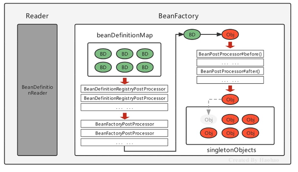 Spring框架会取出BeanDefinition的信息进行判断当前Bean的范围是否是singleton的,是否不是延迟加载的,是否不是FactoryBean等,最终将一个普通的singleton的Bean通过反射进行实例化;