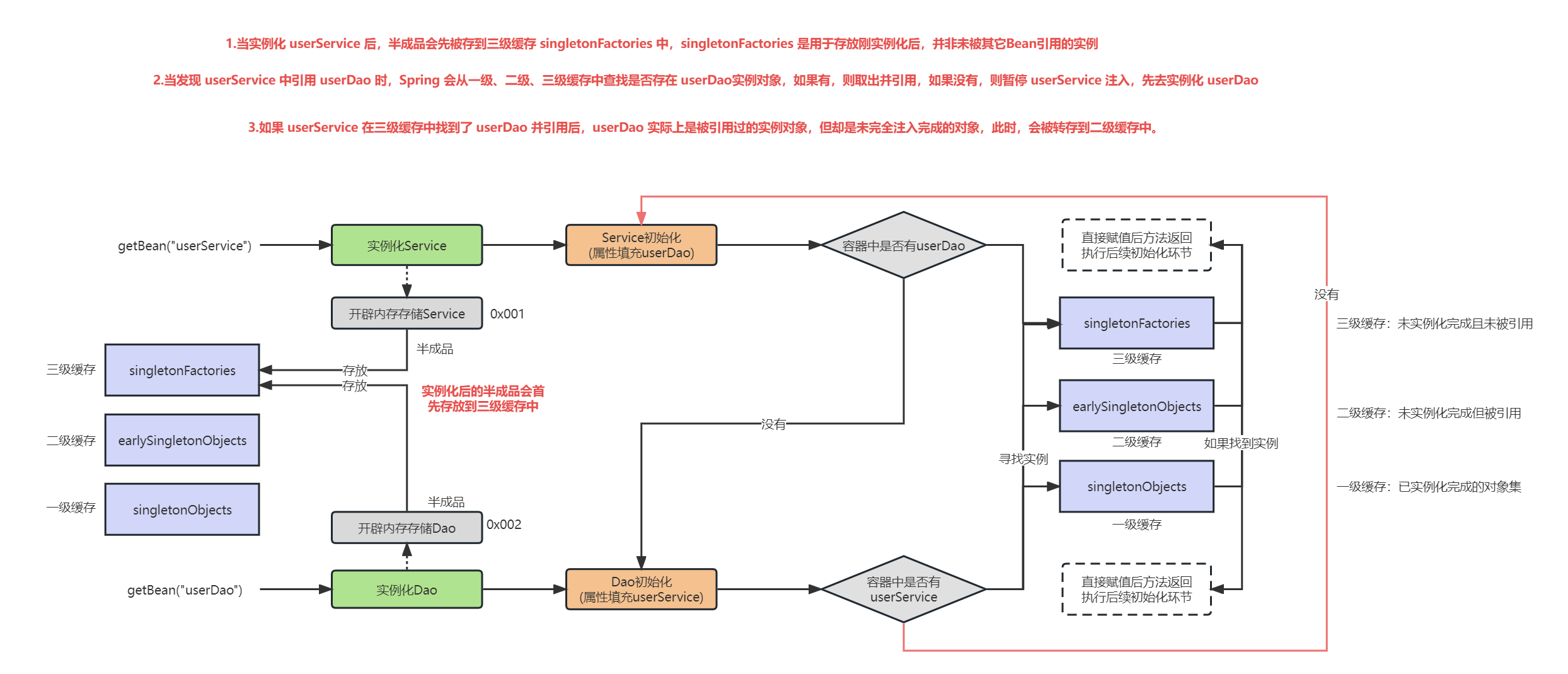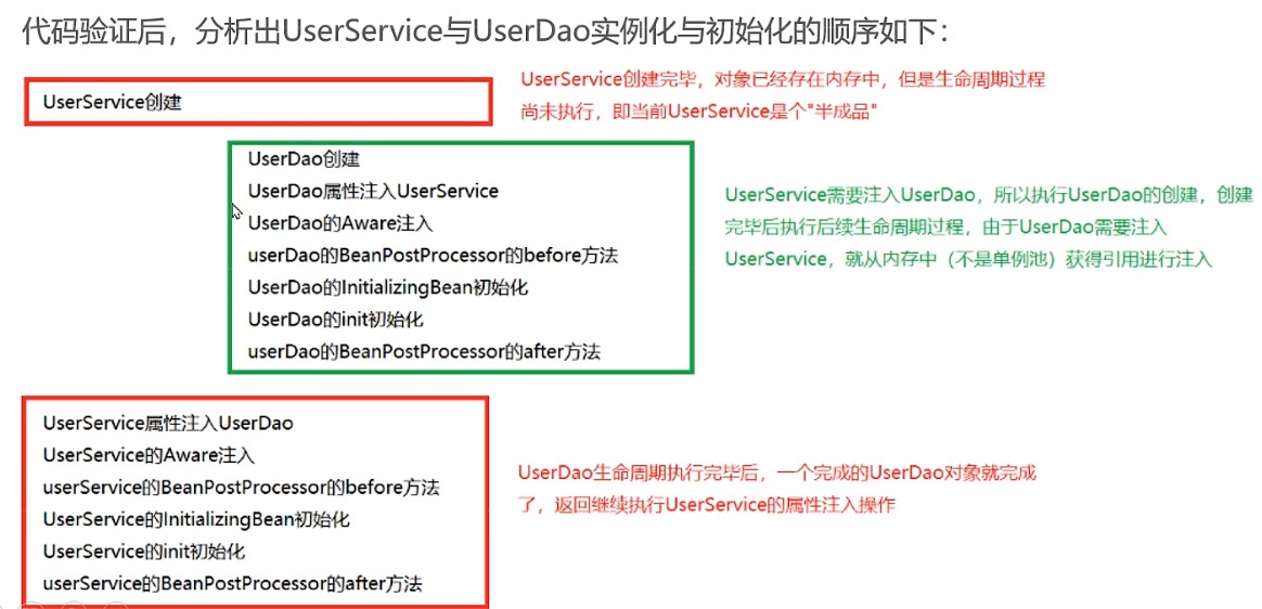 当存在UserService和UserDao时,UserService中需要注入UserDao,UserDao中需要注入UserSrevice时,它们的执行流程如下