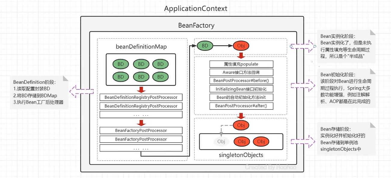 Bean创建之后还仅仅是个"半成品",还需要对Bean实例的属性进行填充、执行一些Aware接口方法、执行BeanPostProcessor方法、执行InitializingBean接口的初始化方法、执行自定义初始化init方法等。该阶段是Spring最具技术含量和复杂度的阶段,Aop增强功能,后面要学习的Spring的注解功能等、 spring高频面试题Bean的循环引用问题都是在这个阶段体现的;