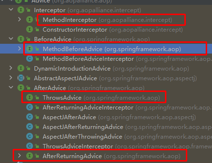 在 Advisor -> Advice 的子接口中,有多个AOP切面接口,通过实现接口方法