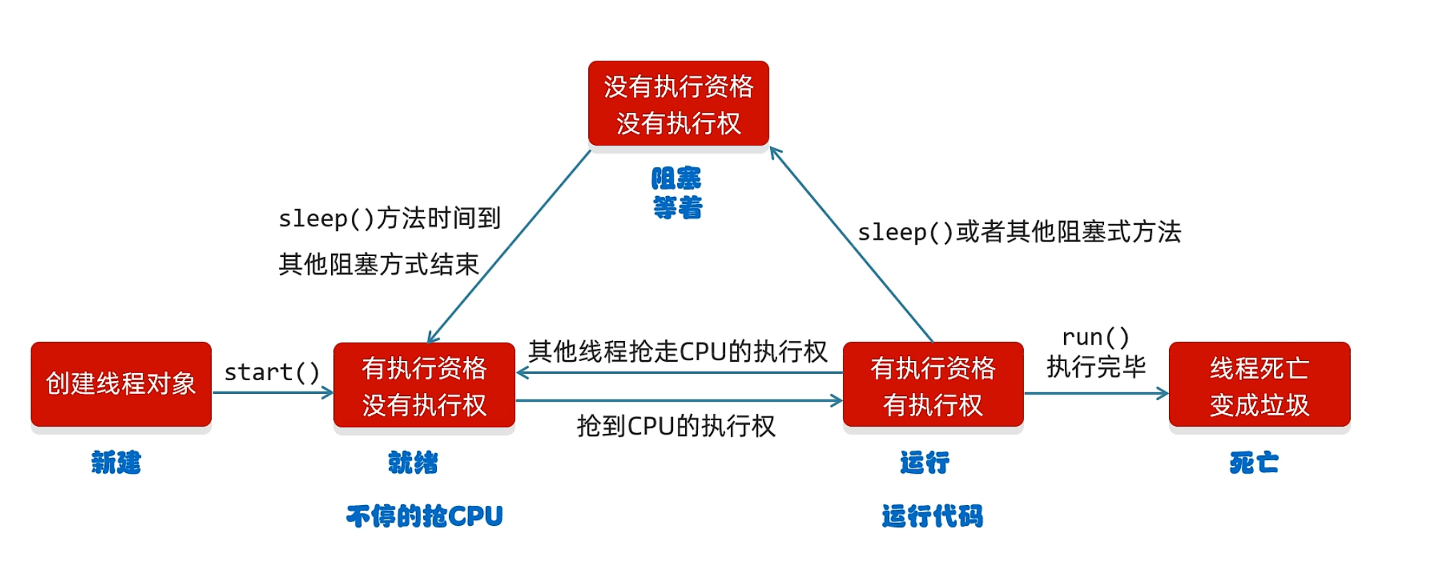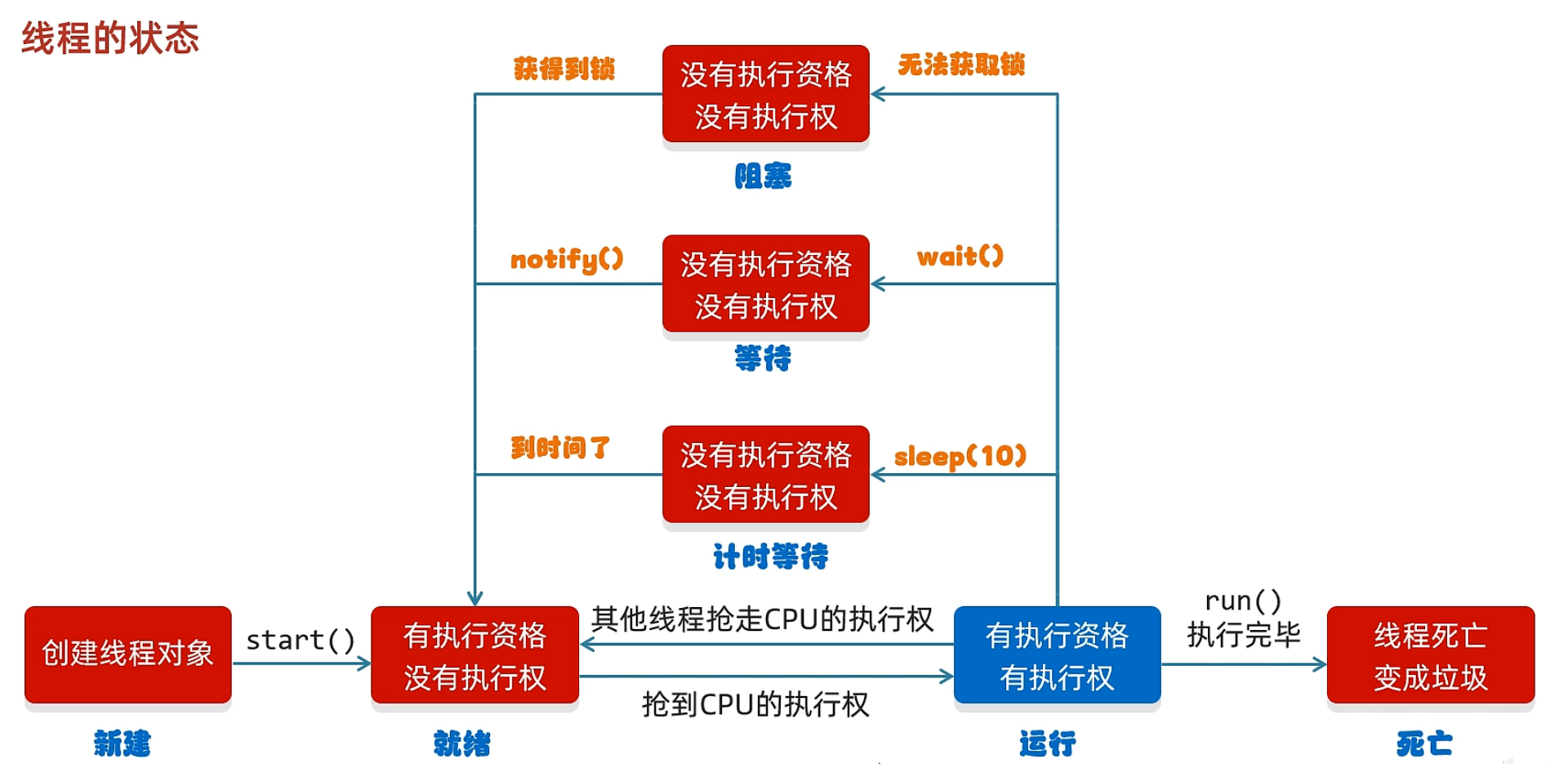 注意:在JVM中,是没有【运行】状态的,因为当线程抢到了CPU执行权时,JVM会交给系统管理,此时的状态是在系统上,非JVM上了。