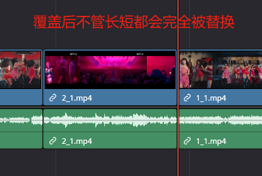 也就是说,如果新的素材内容再长,也只会盖到原素材剩余的长度,总时间线长度保持不变。