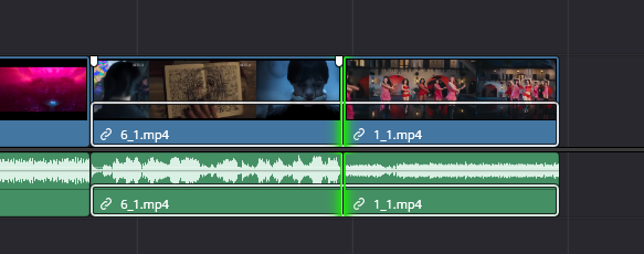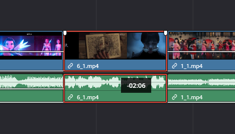 一般来说,一个片段包含视频和音频两个轨道,这个功能是用于 取消/链接 选中的片段中的音视频轨道,一旦解除链接,则音视频轨道将能自由拖动,拖动后会对音视频在轨中的时间差进行计算,即使重新链接音视频轨道,该时间差依然显示。