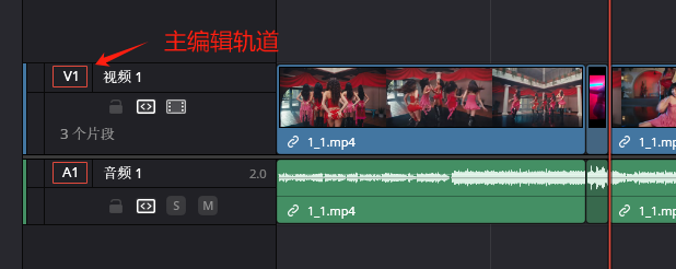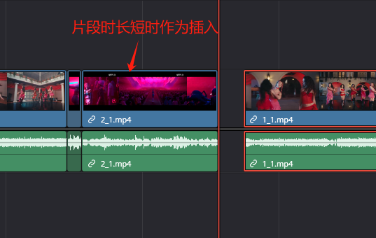 叠加和插入有一定的区别,当主编辑轨道存在空闲时,叠加视频将视为插入。而当主编辑轨道没有空闲时,则叠加新片段时将会插入到其它轨道中,而不会强行加到主编东西轨道中从而改变时间线长度。如下