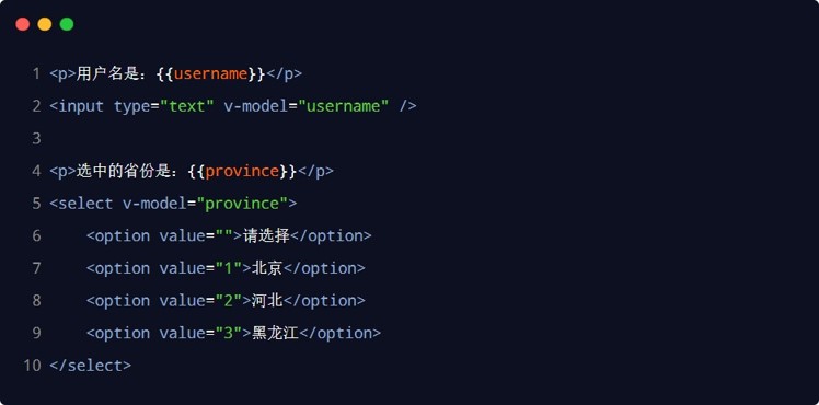 注意:v-model 指令只对表单类元素有意义,如 input textarea select 等等