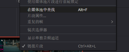 当我们在时间线中找到一个片段,而希望可以找到原素材位置,可以右键找到【在媒体池中查找 Alt+F】
