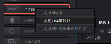 注意,这个过渡不是固定的,我们可以在特效库中对特定一个效果右键【设置为标准转场】即可