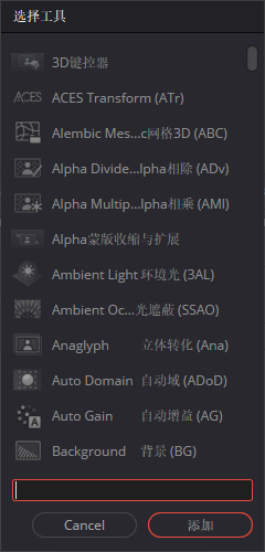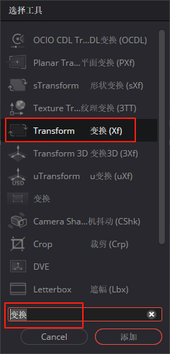 这是一个比较重要的地方,我们可以通过呼出这个功能框,里面包含了所有对图层或特效做的各种效果节点,使用 Ctrl+【空格】 键呼出,呼出后可以通过点选或使用中文或英文去搜索节点,例如让一个图层进行缩放,位移等,可以搜索 transform 或 变换 或 Xf 来搜出