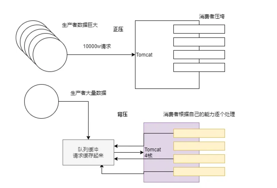 1.正压时,Tomcat需要对每一个任务分配一条线程进行处理,当生产者数据量巨大时,Tomcat无法分配大量线程进行处理,系统会有压垮的可能。