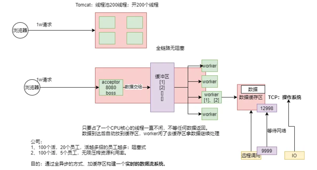 1.上部分表示传统的命令式编程,来200个请求就得开启200个线程(如果可以的话),大量浪费线程