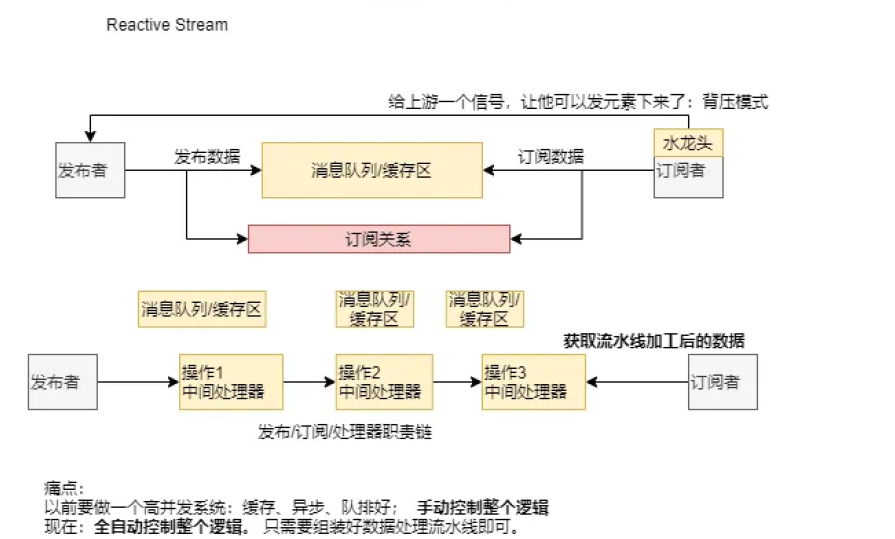 2.下部分:当发布者的数据需要多个工序进行处理时,就出现了“处理器”对象,通过发布者-操作1绑定,操作1-操作2绑定,操作2-操作3绑定,操作3-订阅者绑定的方式,形成一条职责链,对数据进行多方加工。同时,每一个绑定关系中,都有独立之间的缓冲区,用于它们之间的任务与完成操作的异步操作。