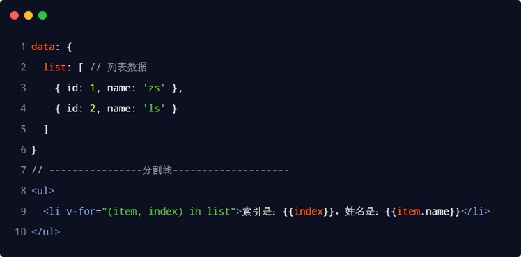 注意:v-for 指令中的 item 项和 index 索引都是形参,可以根据需要进行重命名。例如(user, i) in userlist