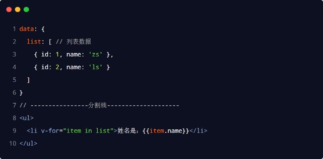 v-for 指令需要使 用 item in list 形式的特殊语法,其中: