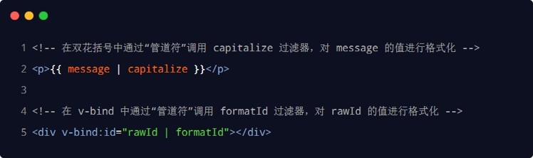 过滤器应该被添加在 JavaScript 表达式的尾部,由“管道符”进行调用
