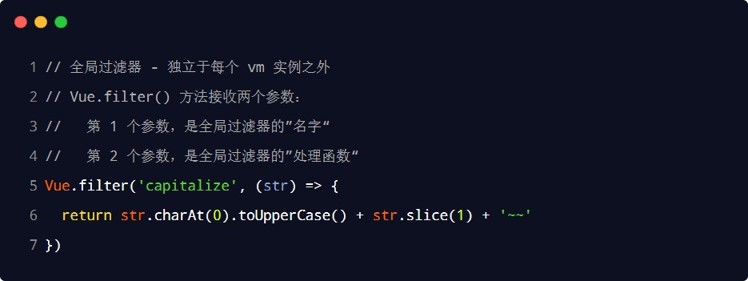 在 filters 节点下定义的过滤器,称为“私有过滤器”,因为它只能在当前vm 实例所控制的el 区域内使用。 如果希望在多个vue 实例之间共享过滤器,则可以按照如下的格式定义全局过滤器