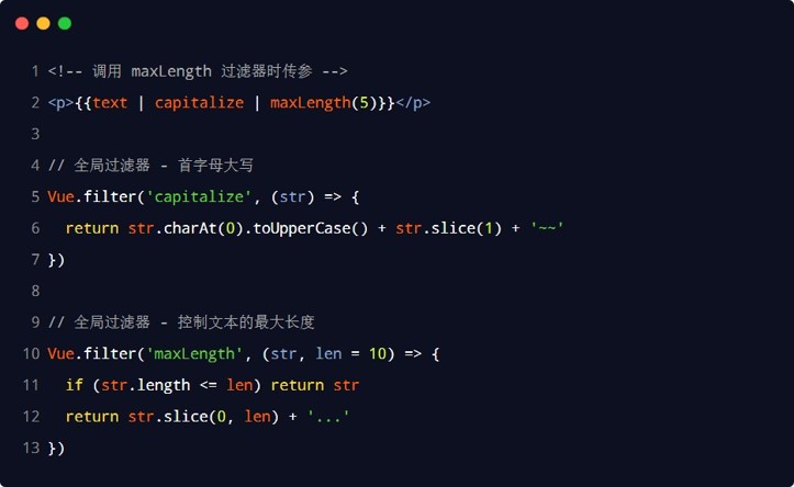注意:因为过滤器必须接收插值数据,因此如果需要在过滤器中传入参数,那么实现涵数形参的接收必须从第二个形参开始,第一个形参将固定为接收插值数据的形参