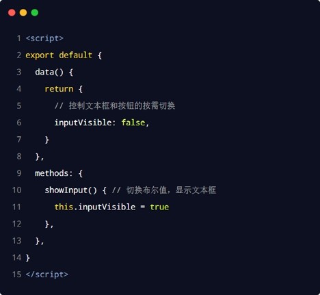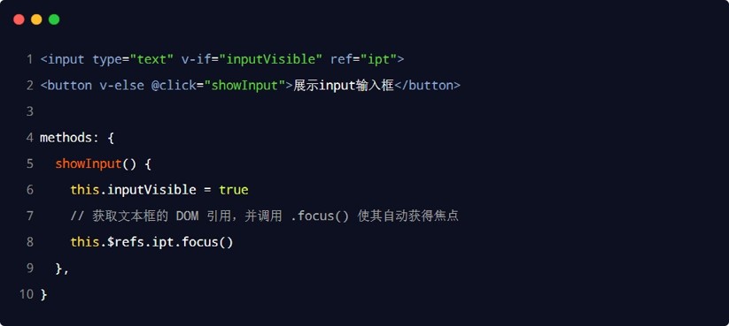 当文本框展示出来之后,如果希望它立即获得焦点,则可以为其添加 ref 引用,并调用原生DOM 对象的 .focus() 方法即可。