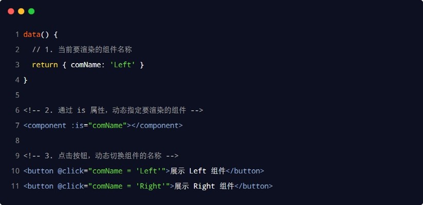 vue 提供了一个内置的 <component> 组件,专门用来实现动态组件的渲染。