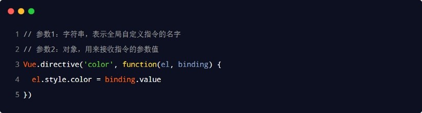 directives:{ <!-- foo 为 v-foo 指令名 --> foo:{ <!-- el 将提供使用这个指令所在的元素原生对象,只要使用指令,就会触发 bind 方法 --> bind(el){ console.log('触发了 v-foo 指令') } } }