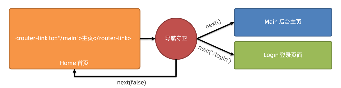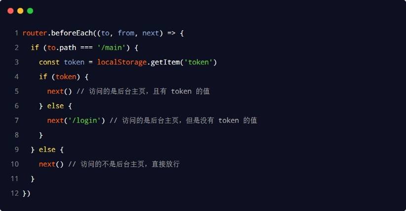next: 它是 vue-router 提供的一个函数,当调用 next() 时,则表示允许跳转到 to 所在的页面。在这里不调用 next() 所有路由跳转将失效。