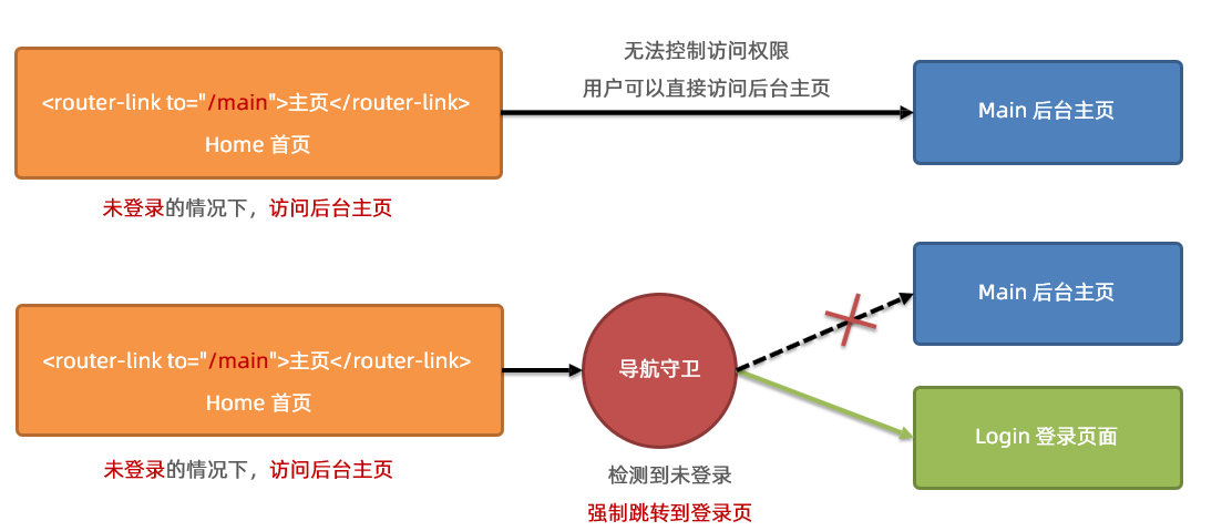 每次发生路由的导航跳转时,都会触发全局前置守卫。因此,在全局前置守卫中,程序员可以对每个路由进行 访问权限的控制。
