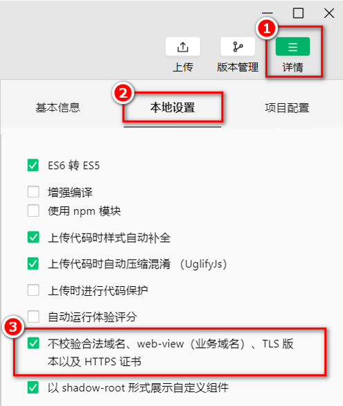 此时为了不耽误开发的进度,我们可以在微信开发者工具中,临时开启「开发环境不校验请求域名、TLS 版本及 HTTPS 证书」选项,跳过 request 合法域名的校验。