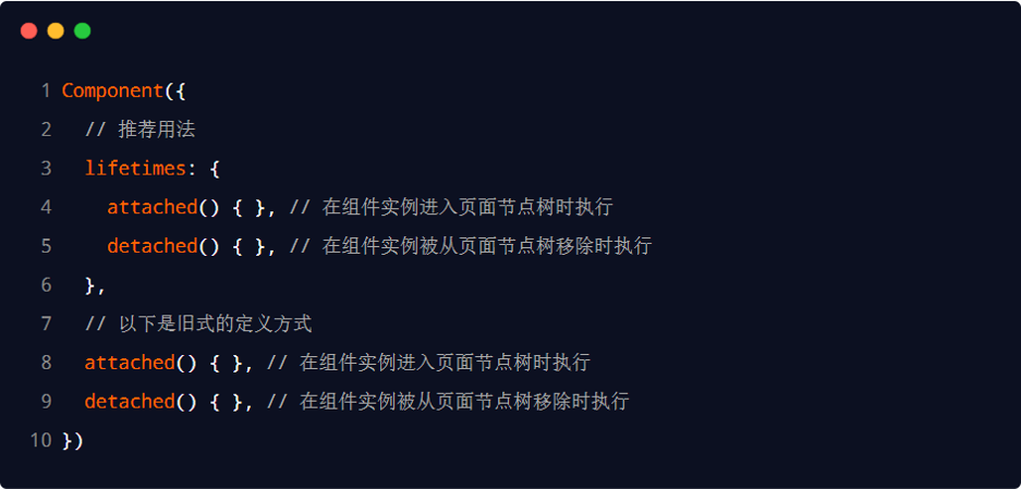 在小程序组件中,生命周期函数可以直接定义在 Component 构造器的第一级参数中,可以在 lifetimes 字段内进行声明(这是推荐的方式,其优先级最高)