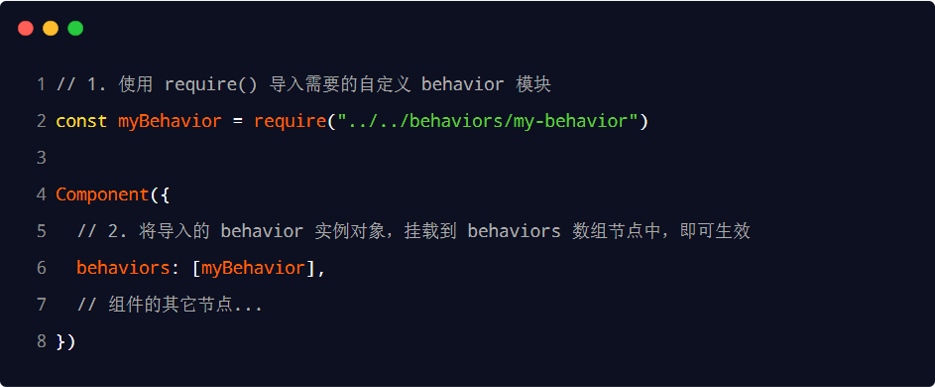 在组件中,使用 require() 方法导入需要的 behavior,挂载后即可访问 behavior 中的数据或方法