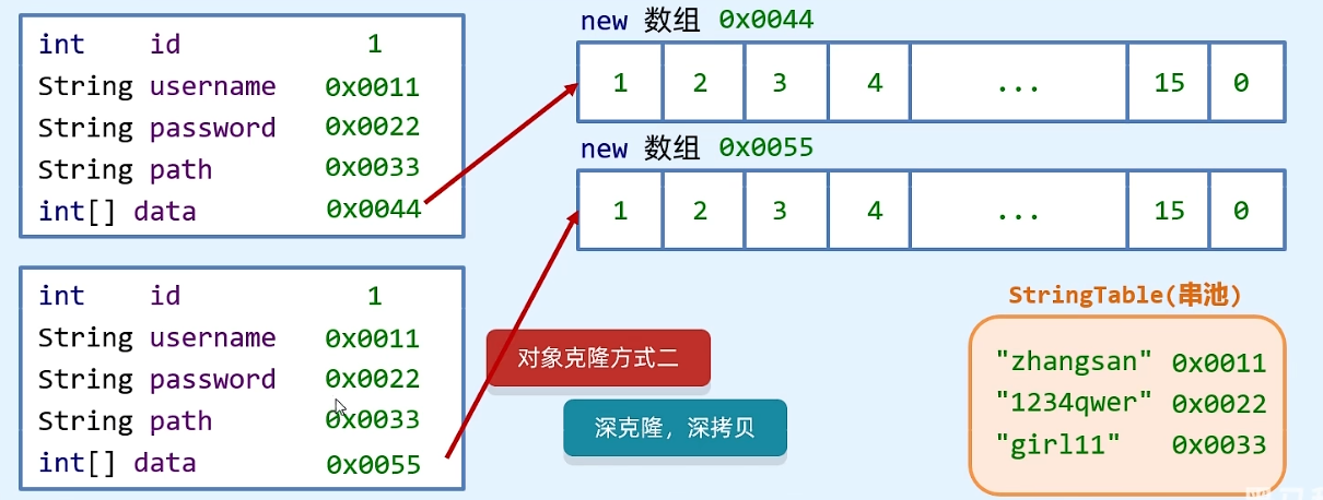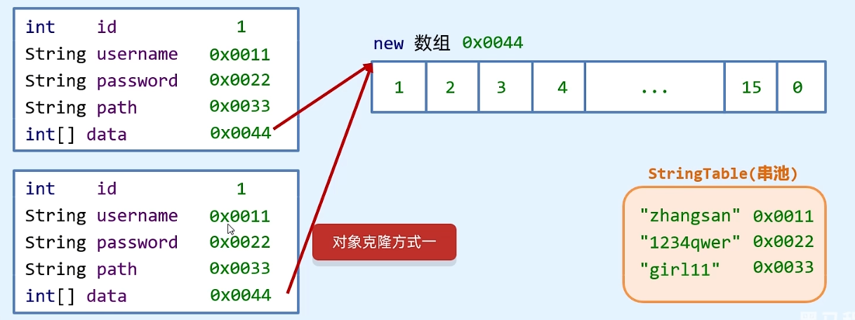 Java 提供的 clone 为浅拷贝,如果克隆的数据只有基础数据类型,则会复制一遍,如果带有引用型数据时,该引用型数据不会被克隆,而仅仅只把引用的内存地址复制一遍。