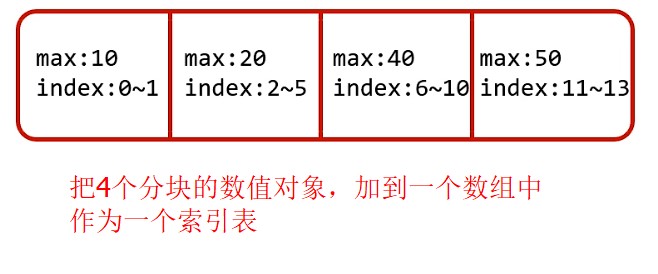 当我们需要查找时,我们选判断,这个值在那个块中可能出现,比如 30 ,我们能过查找索引表发现,第三个成员的 max 值是 40,那么值30,有可能就存在于这一组中,我们单独拎出来对这个组进行遍历就可以。