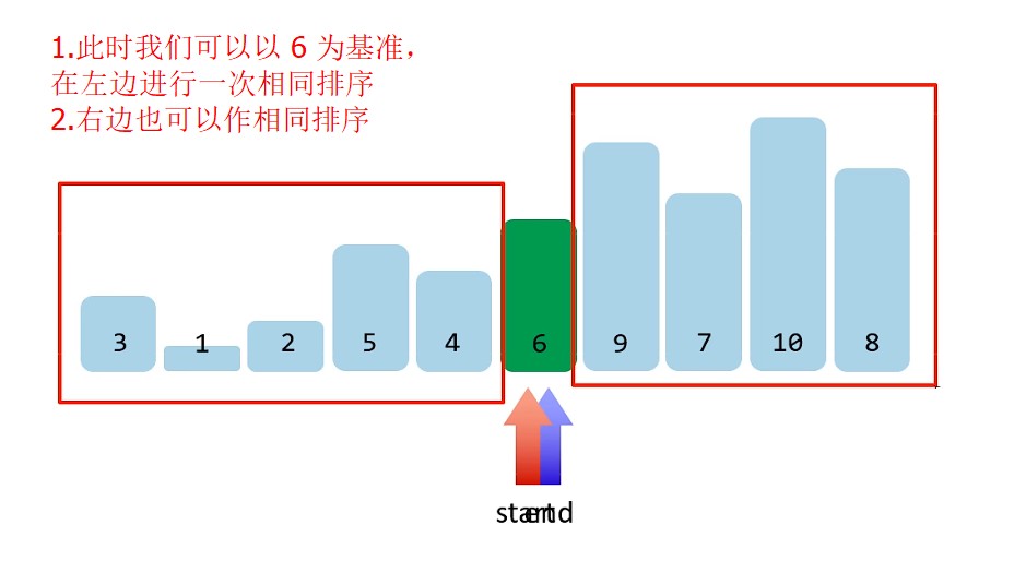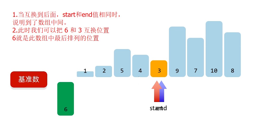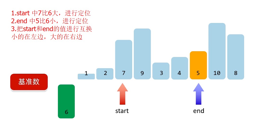 快速排序指的是,开始先从0拿出一个初始索引值,指定 start 索引和 end 索引值,并对0索引进行对比,若start索引值比 初始索引值 大,那么start记录索引位置,end索引值若比 初始索引值 小,也记录索引值,此时 start 索引记录的是比 初始索引值 的值,end 索引值是记录比 初始索引值 小的值,然后start 和 end 索引值位置互换,最终如果 start 索引等于 end 索引,说明他们达到了数组中心,此时,中心值和 初始索引值 位置互换,即位初始索引值所处的数组位置。