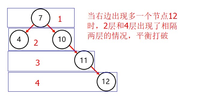 4->12 因为左右都没有节点,所以到12相隔了两层(12在4层,4在2层,4-2=2),打破了平衡