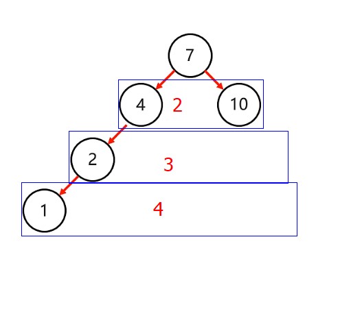 10->1 因为左右都没有节点,与1节点相差两层(4-2=2),根节点被设定为 7